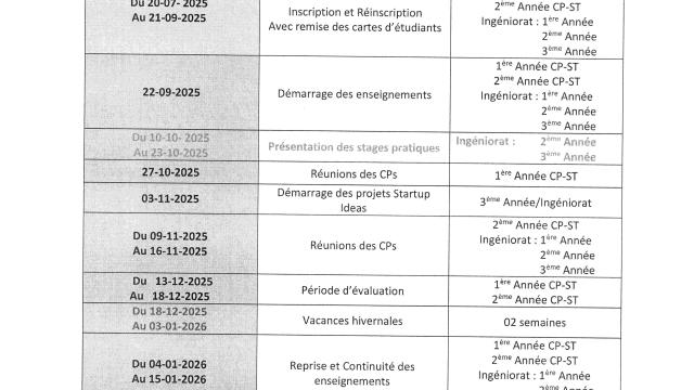 Classes Préparatoires: 1 ère année-S1- 2 ème année -S3- Cycle Ingénieur : DIB: 1 ère année -S1- 2 ème année -S3- 3 ème année -S5- DMS: 1ère année -S1-